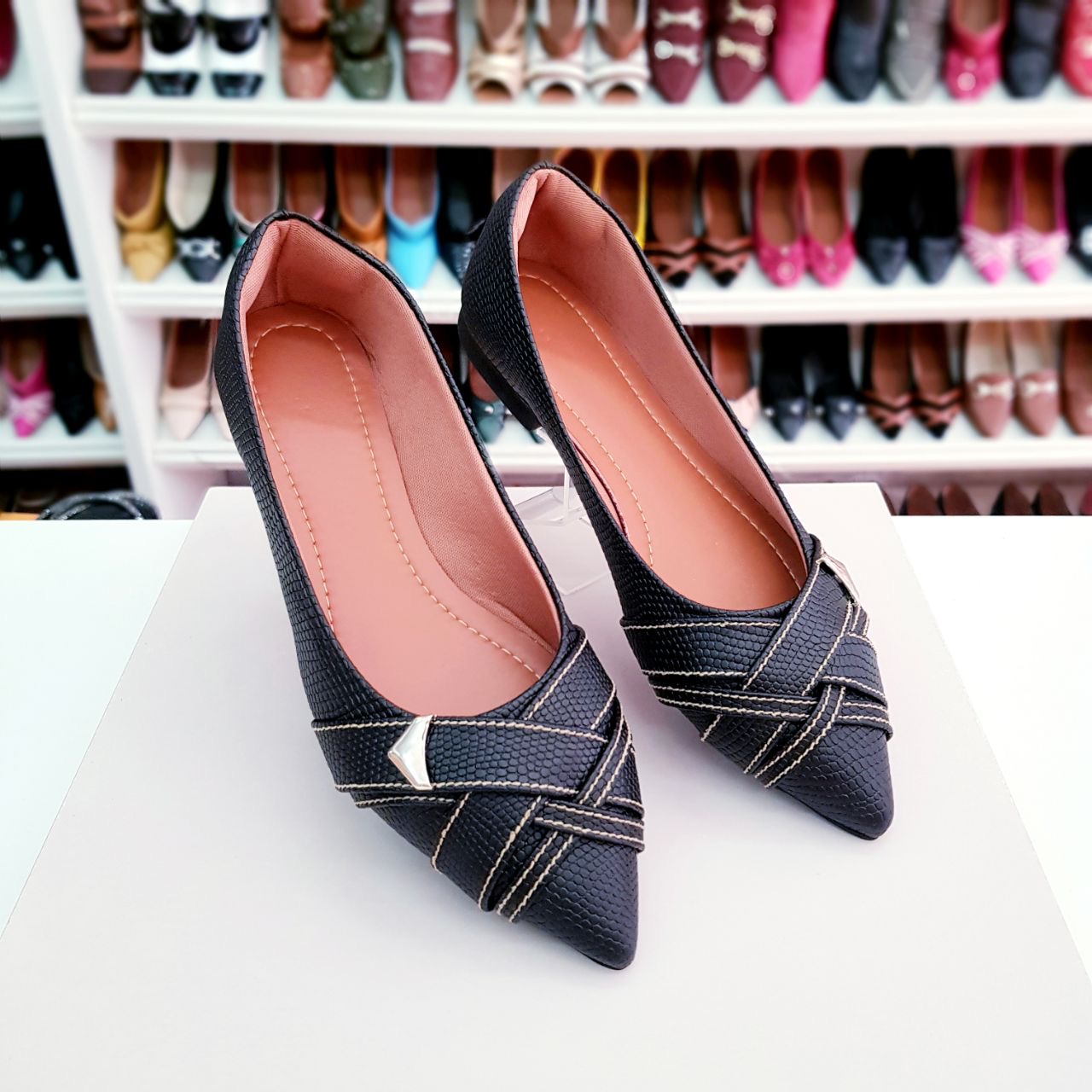 Sapatilha bico fino alongado Adriana Preta Snick com linha branca